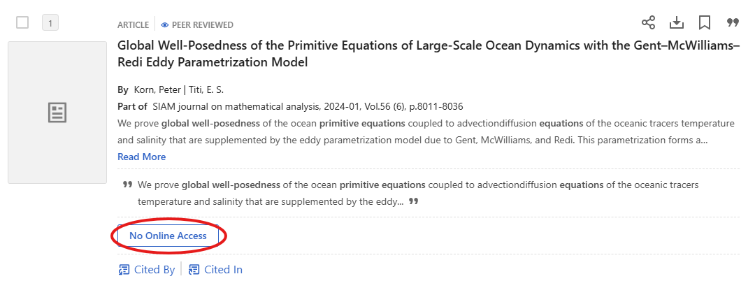 If you then find an article or book chapter without UGent access in your search results, you will see the “No online access” button. You can click on it to see the ILL request button on the details page.